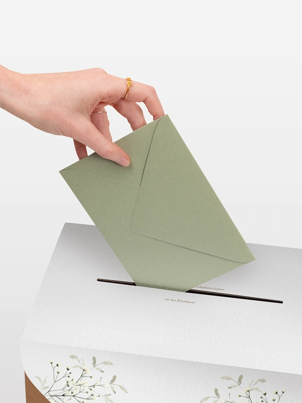 Unsere Kartenbox "Love in Bloom" ist die perfekte Kombination aus Funktionalität und Eleganz. Sie sammelt sicher Glückwunschkarten, Umschläge und kleine Aufmerksamkeiten Ihrer Gäste. Die Kartenbox wird flach geliefert und lässt sich einfach zusammenbauen. Sie enthält eine individuell gestaltbare Papierhülle sowie ein farblich passendes Band. Nach dem Aufbau fügt sie sich stimmig in Ihr Papeterie-Konzept ein und wird zu einem dekorativen Blickfang mit praktischem Nutzen.