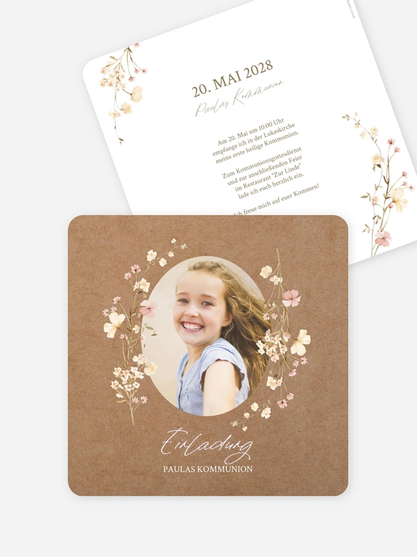 Zarte, wunderschöne Blüten umspielen Ihr Foto auf der Kommunionseinladung "Soft Bloom".