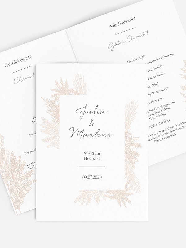 Verleihen Sie Ihrem Hochzeitsmahl einen stylischen und schicken Rahmen mit der zauberhaften Menükarte "Pampasgras".