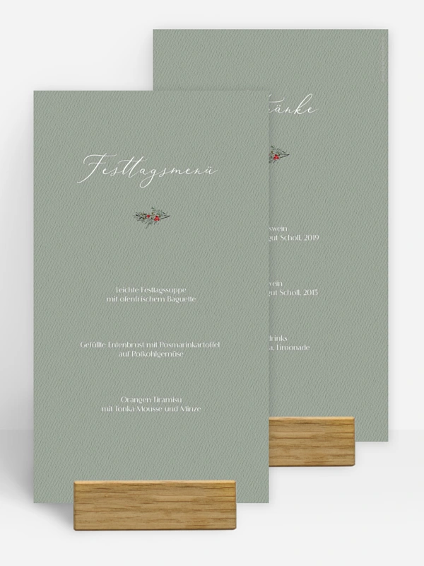 Verleihen Sie Ihrem festlichen Tisch eine ganz persönliche Note mit unserer Menükarte "Classic Wreath". Unsere Weihnachtsmenükarte ist Teil einer liebevoll gestalteten Serie, die perfekt aufeinander abgestimmt ist und sich harmonisch in Ihr gesamtes Tischarrangement einfügt. Das elegante Design, inspiriert von den klassischen Farben und Motiven der Weihnachtszeit, bringt eine festliche Atmosphäre in Ihr Zuhause. Die Menükarte kann individuell angepasst werden, sodass Sie Ihre Speisenfolge oder kreative Weihnachtsbotschaften hinzufügen können. Egal, ob Sie ein traditionelles Festmahl planen oder ein modernes Menü servieren – mit unserer Weihnachtsmenükarte setzen Sie Ihre kulinarischen Kreationen stilvoll in Szene und machen das gemeinsame Essen zu einem unvergesslichen Erlebnis. Überraschen Sie Ihre Familie und Freunde mit dieser einzigartigen und persönlichen Note an Ihrem Weihnachtstisch!