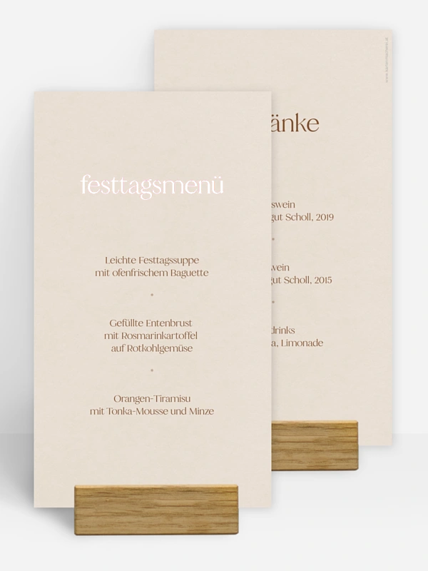 Verleihen Sie Ihrem festlichen Tisch eine ganz persönliche Note mit unserer Menükarte "Moments of joy". Unsere Weihnachtsmenükarte ist Teil einer liebevoll gestalteten Serie, die perfekt aufeinander abgestimmt ist und sich harmonisch in Ihr gesamtes Tischarrangement einfügt. Das elegante Design, inspiriert von den klassischen Farben und Motiven der Weihnachtszeit, bringt eine festliche Atmosphäre in Ihr Zuhause. Die Menükarte kann individuell angepasst werden, sodass Sie Ihre Speisenfolge oder kreative Weihnachtsbotschaften hinzufügen können. Egal, ob Sie ein traditionelles Festmahl planen oder ein modernes Menü servieren – mit unserer Weihnachtsmenükarte setzen Sie Ihre kulinarischen Kreationen stilvoll in Szene und machen das gemeinsame Essen zu einem unvergesslichen Erlebnis. Überraschen Sie Ihre Familie und Freunde mit dieser einzigartigen und persönlichen Note an Ihrem Weihnachtstisch!