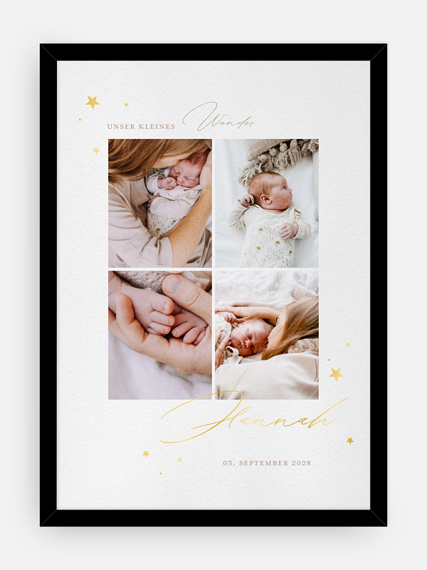 Das Poster „Like Magic“ hält die ersten kostbaren Momente deines kleinen Wunders in einem besonders liebevollen Rahmen fest. Die Kombination aus deinen Lieblingsfotos und den zarten Details macht es zu einer bleibenden Erinnerung, die Wärme und Nähe ausstrahlt. So kannst du die Geburt deines Kindes auf wunderschöne Weise feiern und sichtbar machen. Gedruckt auf hochwertigem Papier und mit schneller Lieferung zu dir nach Hause – damit dein Erinnerungsstück bald an seinem Platz erstrahlt.