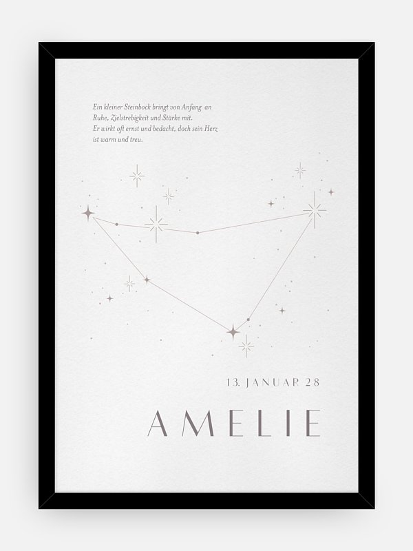 „Sternbild Steinbock“ steht für Stärke, Ausdauer und stille Geborgenheit. Das Geburtsposter ist ein Symbol für die ersten Schritte ins Leben – klein, aber voller Bedeutung. Wunderschön für das Kinderzimmer oder als Geschenk zur Geburt. Mit viel Liebe für dich gefertigt.