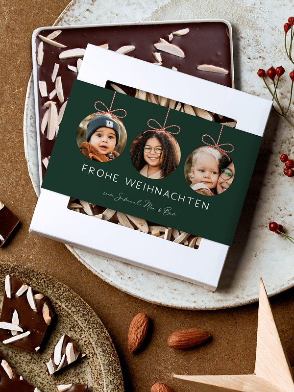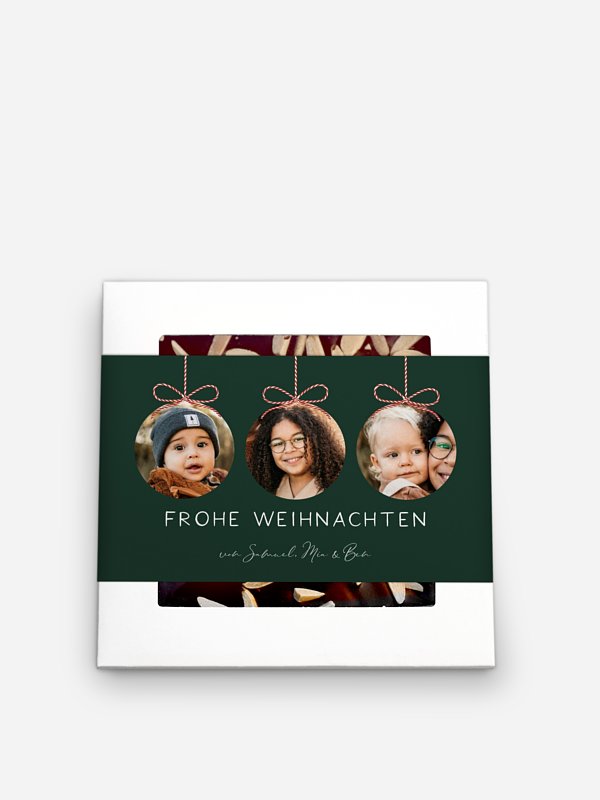 Vervollständigen Sie Ihre Weihnachtspost mit einer handgeschöpften Schokolade und einer personalisierbaren Banderole im Kartendesign "Fotokugeln". Handgeschöpfte Pralinenschokolade mit gerösteten Mandelsplittern Zutaten: Premium-Zartbitterschokolade (Kakaomasse; Zucker; Kakaobutter; Emulgator: SOJAlecithin; natürliches Vanille-Aroma), geröstete MANDELsplitter 10 % Kakao: mindestens 60 % in der Edel-Zartbitter-Schokolade Hergestellt in Deutschland Bitte kühl, dunkel und trocken lagern Mindestens haltbar bis: siehe Stempel Gewicht: 80 g