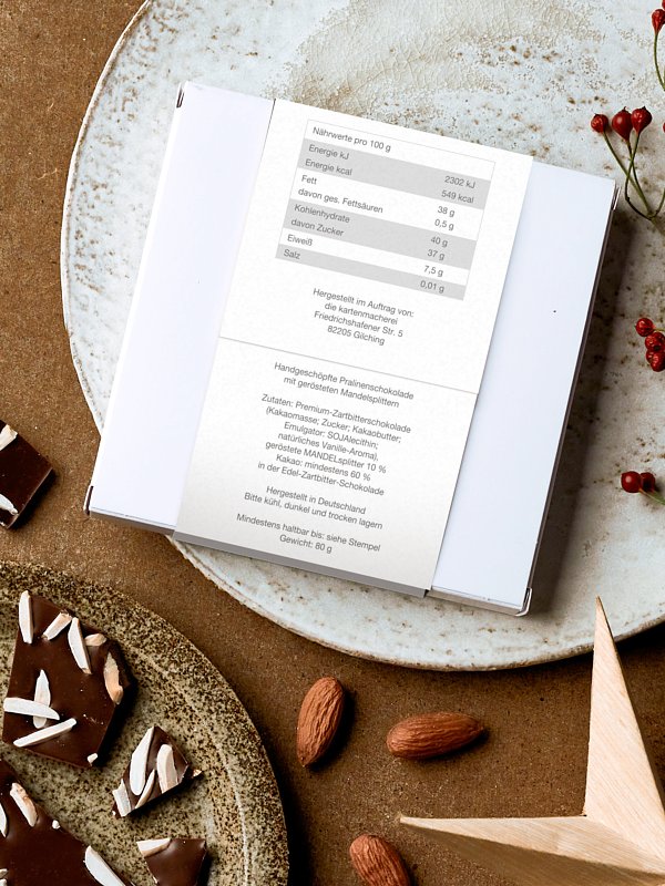 Vervollständigen Sie Ihre Weihnachtspost mit einer handgeschöpften Schokolade und einer personalisierbaren Banderole. Handgeschöpfte Pralinenschokolade mit gerösteten Mandelsplittern Zutaten: Premium-Zartbitterschokolade (Kakaomasse; Zucker; Kakaobutter; Emulgator: SOJAlecithin; natürliches Vanille-Aroma), geröstete MANDELsplitter 10 % Kakao: mindestens 60 % in der Edel-Zartbitter-Schokolade Hergestellt in Deutschland Bitte kühl, dunkel und trocken lagern Mindestens haltbar bis: siehe Stempel Gewicht: 80 g