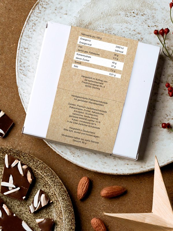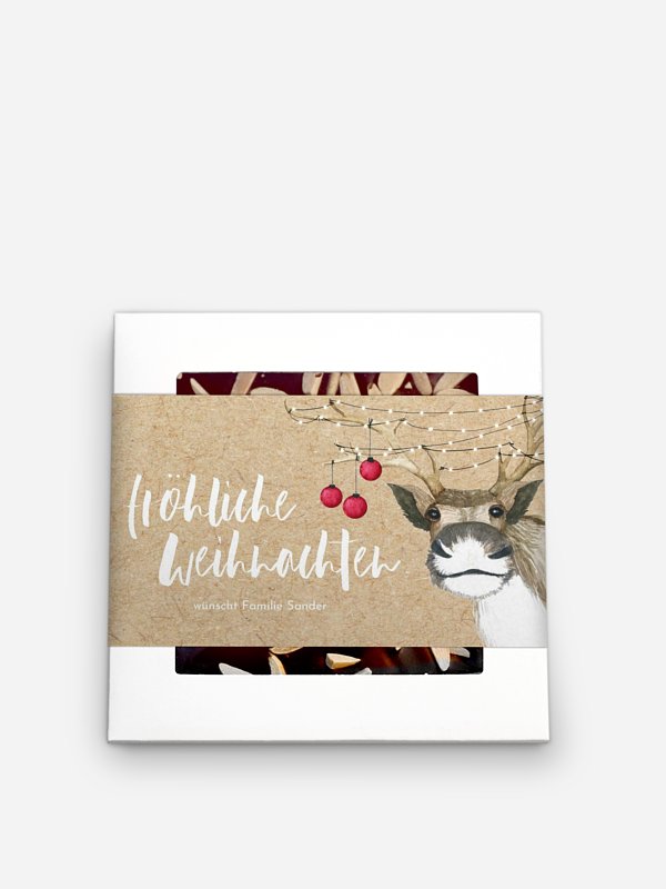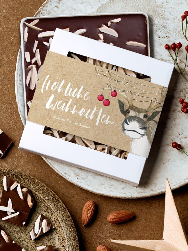 Vervollständigen Sie Ihre Weihnachtspost mit einer handgeschöpften Schokolade und einer personalisierbaren Banderole im Kartendesign "Rentier". Handgeschöpfte Pralinenschokolade mit gerösteten Mandelsplittern Zutaten: Premium-Zartbitterschokolade (Kakaomasse; Zucker; Kakaobutter; Emulgator: SOJAlecithin; natürliches Vanille-Aroma), geröstete MANDELsplitter 10 % Kakao: mindestens 60 % in der Edel-Zartbitter-Schokolade Hergestellt in Deutschland Bitte kühl, dunkel und trocken lagern Mindestens haltbar bis: siehe Stempel Gewicht: 80 g
