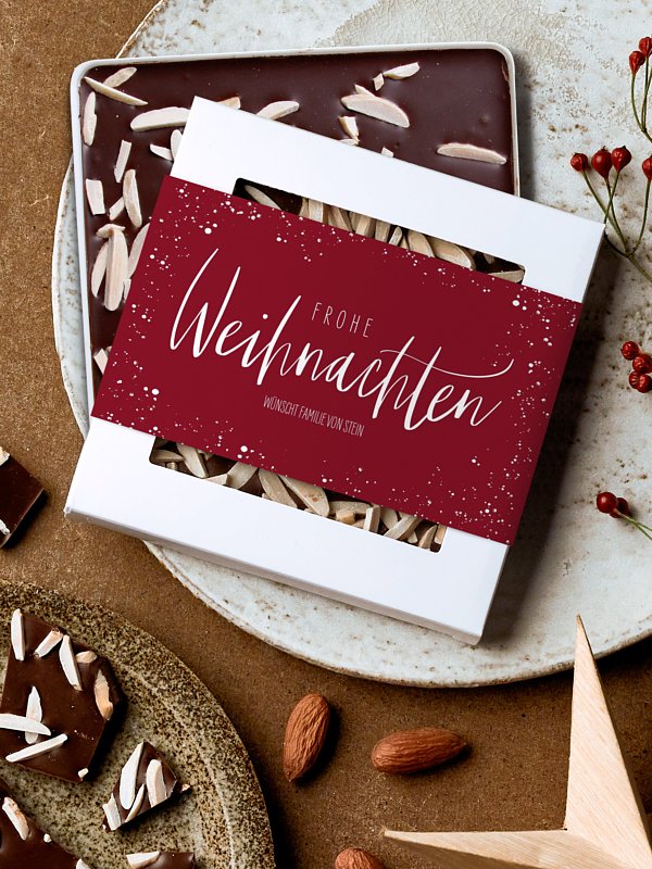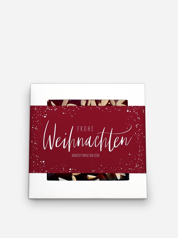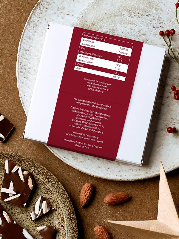 Vervollständigen Sie Ihre Weihnachtspost mit einer handgeschöpften Schokolade und einer personalisierbaren Banderole im Kartendesign "Schneeglanz". Handgeschöpfte Pralinenschokolade mit gerösteten Mandelsplittern Zutaten: Premium-Zartbitterschokolade (Kakaomasse; Zucker; Kakaobutter; Emulgator: SOJAlecithin; natürliches Vanille-Aroma), geröstete MANDELsplitter 10 % Kakao: mindestens 60 % in der Edel-Zartbitter-Schokolade Hergestellt in Deutschland Bitte kühl, dunkel und trocken lagern Mindestens haltbar bis: siehe Stempel Gewicht: 80 g