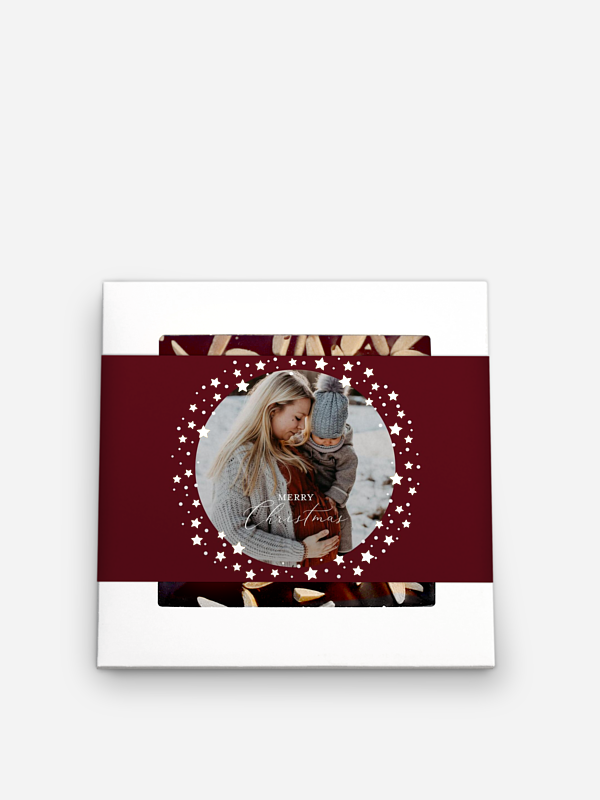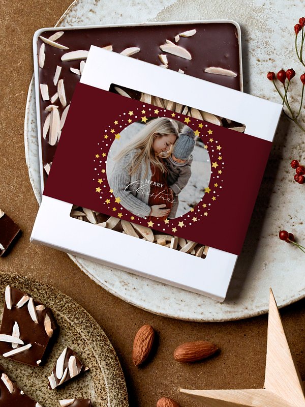 Vervollständigen Sie Ihre Weihnachtspost mit einer handgeschöpften Schokolade und einer personalisierbaren Banderole im Kartendesign "Stellina". Handgeschöpfte Pralinenschokolade mit gerösteten Mandelsplittern Zutaten: Premium-Zartbitterschokolade (Kakaomasse; Zucker; Kakaobutter; Emulgator: SOJAlecithin; natürliches Vanille-Aroma), geröstete MANDELsplitter 10 % Kakao: mindestens 60 % in der Edel-Zartbitter-Schokolade Hergestellt in Deutschland Bitte kühl, dunkel und trocken lagern Mindestens haltbar bis: siehe Stempel Gewicht: 80 g