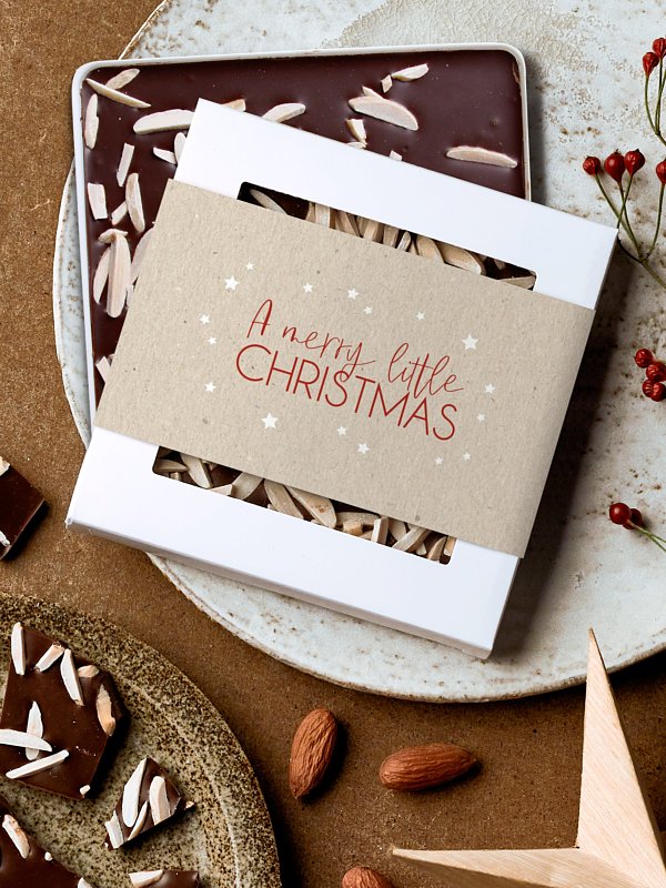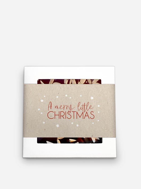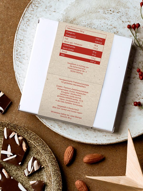 Vervollständigen Sie Ihre Weihnachtspost mit einer handgeschöpften Schokolade und einer personalisierbaren Banderole im Kartendesign "Sternenzauber". Handgeschöpfte Pralinenschokolade mit gerösteten Mandelsplittern Zutaten: Premium-Zartbitterschokolade (Kakaomasse; Zucker; Kakaobutter; Emulgator: SOJAlecithin; natürliches Vanille-Aroma), geröstete MANDELsplitter 10 % Kakao: mindestens 60 % in der Edel-Zartbitter-Schokolade Hergestellt in Deutschland Bitte kühl, dunkel und trocken lagern Mindestens haltbar bis: siehe Stempel Gewicht: 80 g