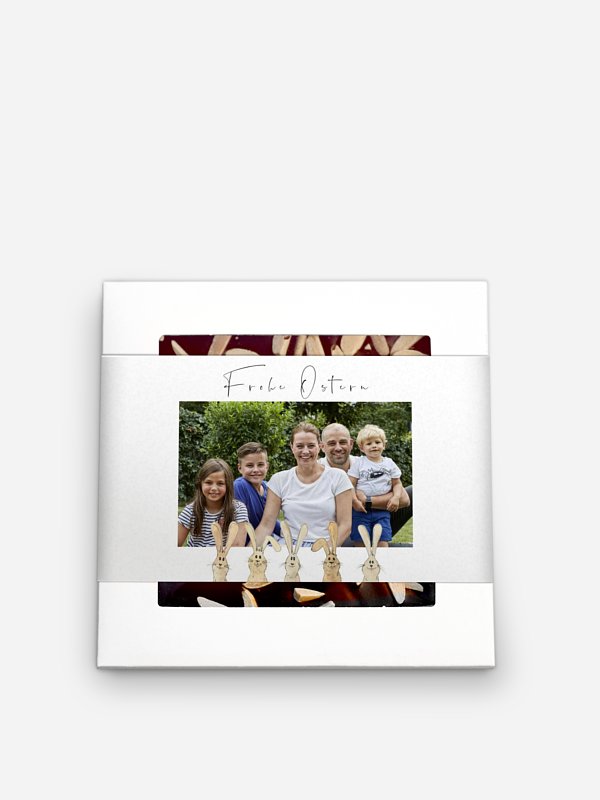 Schöne Geschenkidee: Die Schokolade "Hasenbande" ist geschmückt mit niedlichen Hasen und dem schönsten Foto Ihrer Familie.
