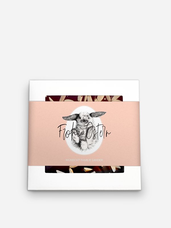 Wunderschön illustriert und edel mit Goldveredelung. Die Schokolade "Osterhäschen" sorgt mit Sicherheit für eine gelungene Überraschung zum Osterfest.