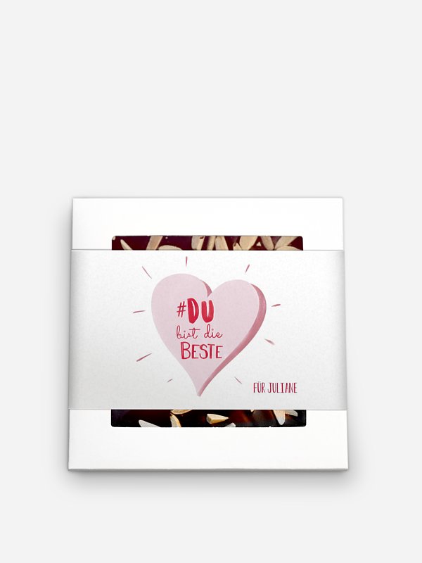 Verschenken Sie die handgeschöpfte Pralinenschokolade mit der personalisierbaren Hülle "Lovely Calligraphy" und verwöhnen Sie Ihre Liebsten zu Weihnachten. Handgeschöpfte Pralinenschokolade mit gerösteten Mandelsplittern Zutaten: Premium-Zartbitterschokolade (Kakaomasse; Zucker; Kakaobutter; Emulgator: SOJAlecithin; natürliches Vanille-Aroma), geröstete MANDELsplitter 10 % Kakao: mindestens 60 % in der Edel-Zartbitter-Schokolade Hergestellt in Deutschland Bitte kühl, dunkel und trocken lagern Gewicht: 80 g