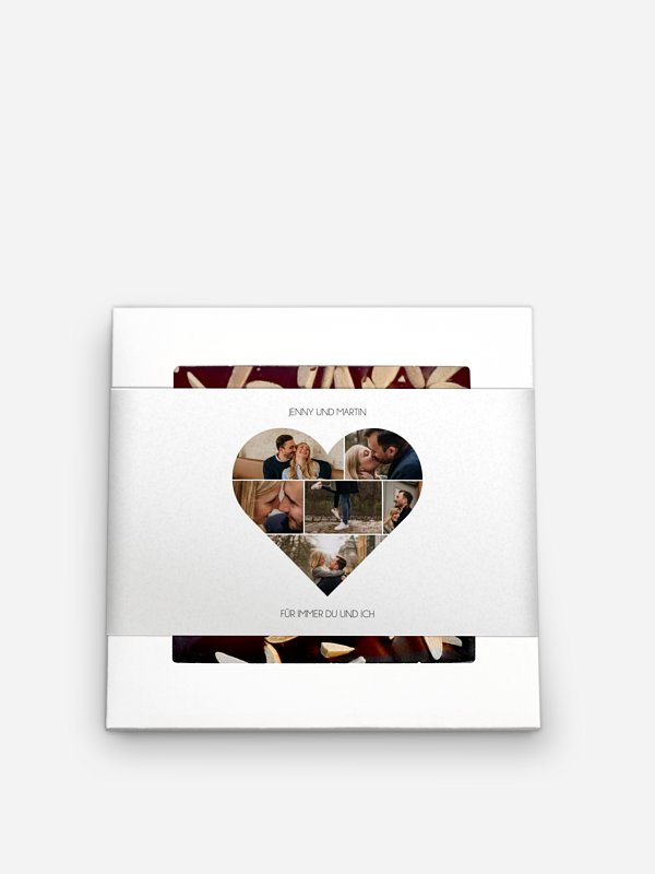 Verschenken Sie die handgeschöpfte Pralinenschokolade mit der personalisierbaren Hülle "Im Herzen" und verwöhnen Sie Ihre Liebsten zu Weihnachten. Handgeschöpfte Pralinenschokolade mit gerösteten Mandelsplittern Zutaten: Premium-Zartbitterschokolade (Kakaomasse; Zucker; Kakaobutter; Emulgator: SOJAlecithin; natürliches Vanille-Aroma), geröstete MANDELsplitter 10 % Kakao: mindestens 60 % in der Edel-Zartbitter-Schokolade Hergestellt in Deutschland Bitte kühl, dunkel und trocken lagern Gewicht: 80 g