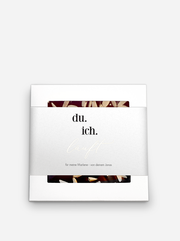 Verschenken Sie die handgeschöpfte Pralinenschokolade mit der personalisierbaren Hülle "Lovely Calligraphy" und verwöhnen Sie Ihre Liebsten zu Weihnachten. Handgeschöpfte Pralinenschokolade mit gerösteten Mandelsplittern Zutaten: Premium-Zartbitterschokolade (Kakaomasse; Zucker; Kakaobutter; Emulgator: SOJAlecithin; natürliches Vanille-Aroma), geröstete MANDELsplitter 10 % Kakao: mindestens 60 % in der Edel-Zartbitter-Schokolade Hergestellt in Deutschland Bitte kühl, dunkel und trocken lagern Gewicht: 80 g