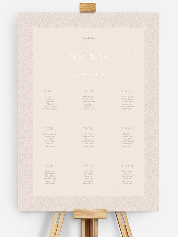 Das stilvolle Sitzplan Plakat "Liebesgeschichte" zeigt Ihren Gästen auf einen Blick, an welchem Tisch sie Platz nehmen dürfen – ein eleganter Empfang gleich beim Ankommen.