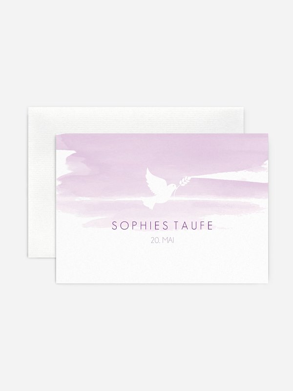 Wie mit zarten Wasserfarben gemalt: Die Taufeinladung „Aquarellbild” mit der Friedenstaube als zentralem Element ist eine klassische und gleichzeitig moderne Papeterie, um stilvoll zur Taufe Ihres Kindes einzuladen.