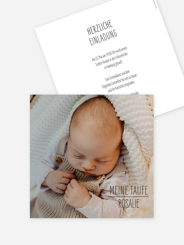 Mit der liebevoll gestalteten Taufeinladung "Essenza" lädst du deine Lieblingsmenschen auf eine ganz besondere Weise ein, diesen emotionalen Moment gemeinsam mit euch zu feiern. Das natürliche Design lässt viel Raum für ein herzliches Foto deines Schatzes und macht die Karte zu einer persönlichen Erinnerung, die man immer wieder gerne anschaut. In unserem Gestaltungs-Tool kannst du deine Einladung zur Taufe ganz einfach online konfigurieren und nach deinen Wünschen anpassen. Wir drucken dein Design auf hochwertigen Papieren, damit deine Post schon bald voller Vorfreude bei deinen Gästen ankommt. Gestalte jetzt dein Set direkt online.
