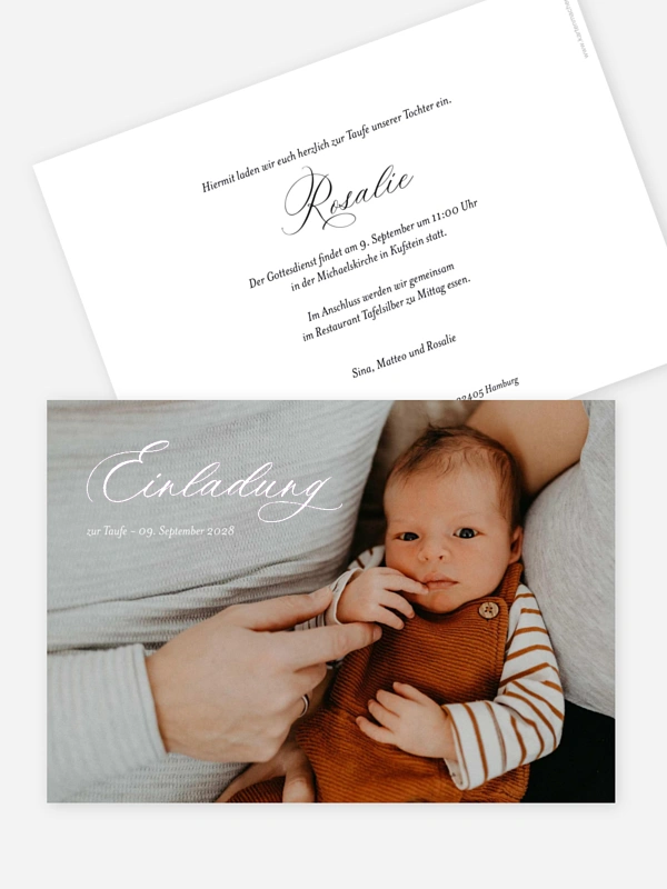 Mit der Taufeinladung "Feine Schriftkunst" ladet ihr eure Lieblingsmenschen auf besonders herzliche Weise ein, diesen Meilenstein gemeinsam mit euch zu feiern. Das liebevolle Design bietet viel Platz für ein schönes Foto eures kleinen Schatzes und macht die Vorfreude auf das Fest für alle spürbar.