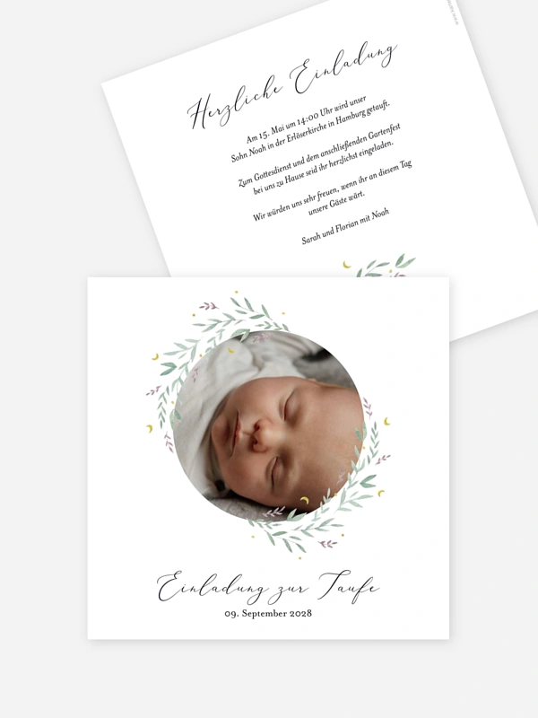 Mit der liebevollen Taufeinladung "Herzensfest" lädst du deine Lieblingsmenschen auf besonders herzliche Weise ein, diesen Tag gemeinsam mit euch zu feiern. Die zarten, naturverbundenen Illustrationen umrahmen das schönste Foto deines kleinen Schatzes und machen die Einladung zur Taufe zu einer wertvollen Erinnerung für die ganze Familie.