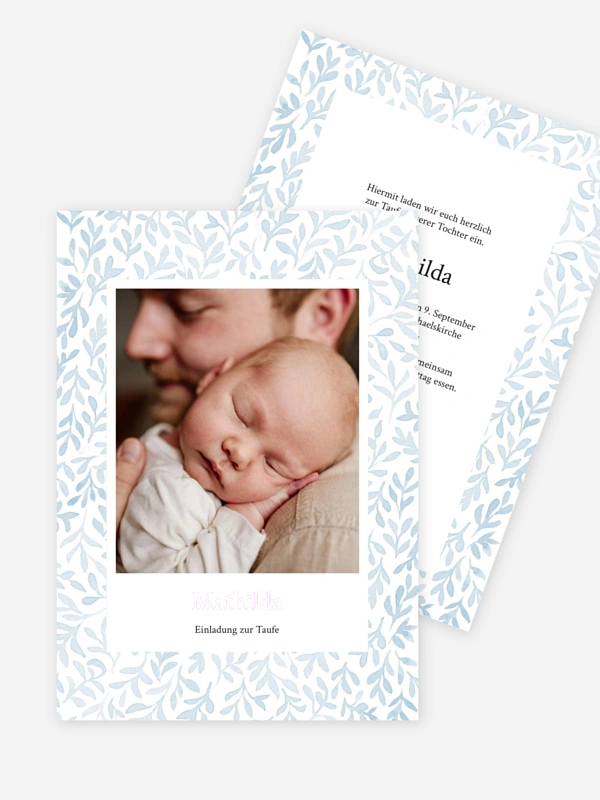 Mit der liebevoll gestalteten Taufkarte "Herzensmelodie" lädst du deine Lieblingsmenschen auf eine besonders herzliche Weise ein, diesen Moment gemeinsam mit euch zu feiern. Das natürliche Design mit den zarten Blättern rahmt das Foto deines Schatzes wunderbar ein und macht eure Einladung zur Taufe zu einer bleibenden Erinnerung für Familie und Freunde.