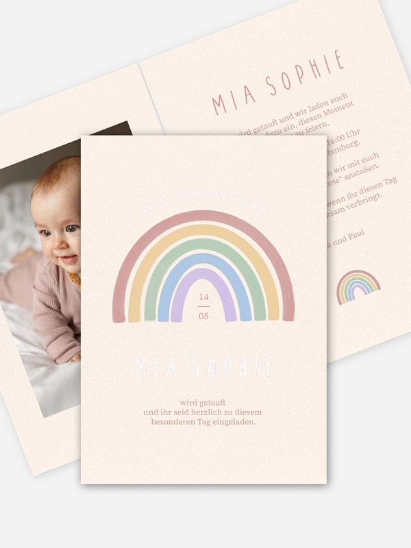 Die Taufeinladung „Pastel Arc“ vereint zarte Regenbogenfarben mit einem modernen, ruhigen Design – ideal, um Familie und Freund:innen zu einem liebevollen Willkommensfest für euer Baby einzuladen. Die sanften Bögen des Regenbogens stehen symbolisch für Hoffnung, Schutz und einen neuen Anfang und verleihen der Karte eine warme, harmonische Ausstrahlung. Feine Illustrationen und eine klare Gestaltung machen die Einladung zu einem besonderen Gruß, der die Vorfreude auf diesen bedeutenden Tag wunderschön einfängt. Dank der einfachen Personalisierung im Gestaltungs-Tool kannst du Text, Farben und Details ganz nach euren Wünschen anpassen. Hochwertige Druckmaterialien sorgen dafür, dass die Karte genauso sanft und wertvoll wirkt wie der Anlass selbst.