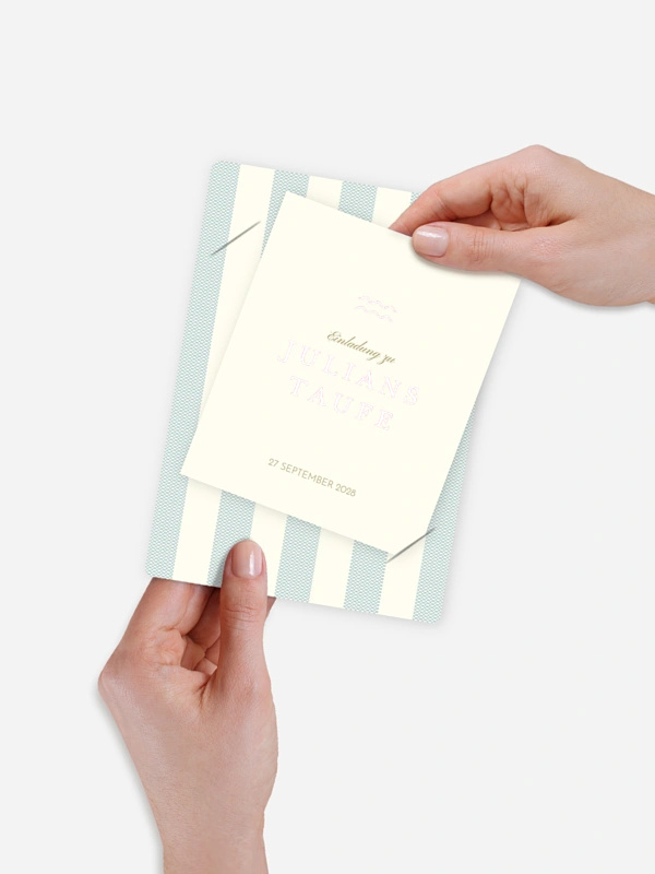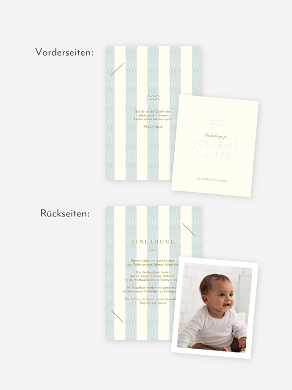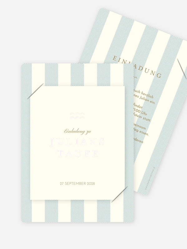 Unsere herzliche Taufeinladung "Sacred Wave" besticht durch ihr zeitloses Streifendesign und eine sanfte Wellen-Symbolik, die wunderbar zur Taufe passt. Mit dieser Karte kündigst du das erste große Fest deines Kindes auf besonders stilvolle Weise an und lädst Freunde sowie Familie ein, diesen Meilenstein gemeinsam zu feiern. Die einfache Konfiguration im Gestaltungs-Tool ermöglicht es dir, das schönste Foto deines Lieblings und alle wichtigen Details im Handumdrehen einzufügen. Wir sorgen mit hochwertigem Druck und einer schnellen Lieferung dafür, dass deine Taufkarten pünktlich und in bester Qualität bei dir eintreffen.