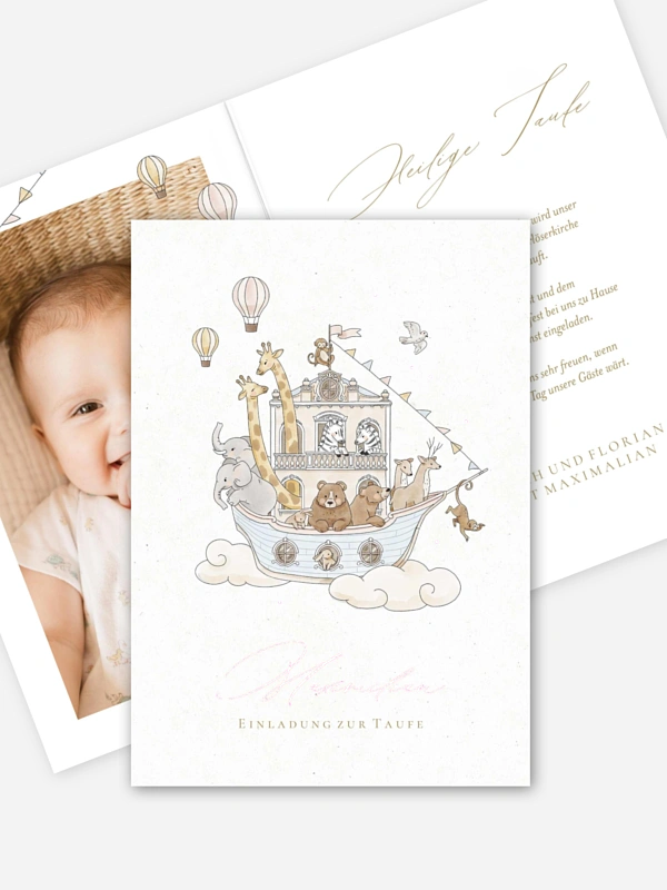 Die Taufeinladung "Sweet Arch" erzählt mit ihrer liebevollen Illustration eine kleine Geschichte voller Vertrauen und Wärme – genau richtig, um deine Liebsten zu diesem besonderen Tag einzuladen. Die niedlichen Tierfiguren machen die Einladung zur Taufe zu einem fröhlichen Vorgeschmack auf euren gemeinsamen Moment. Dein Foto bringt zusätzlich eine ganz persönliche Note hinein. Du kannst die Karte im Gestaltungs‑Tool ganz einfach anpassen, und wir drucken sie für dich auf hochwertigen Papieren – damit sie genauso herzlich ankommt wie gedacht.