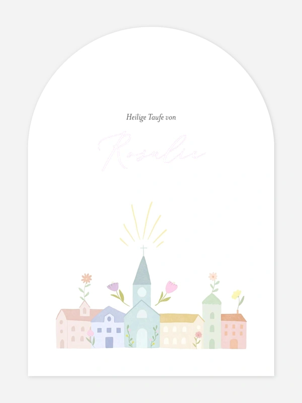 Die liebevoll illustrierten Blumen und die sanft strahlende Kirche auf deiner Taufeinladung "Tauflicht" laden deine Liebsten auf besonders herzliche Weise zum einzigartigen Tag deines kleinen Schatzes ein. Diese Karte ist eine wunderbare Möglichkeit, die Einladung zur Taufe mit einem Gefühl von Geborgenheit und Freude zu verbinden.
