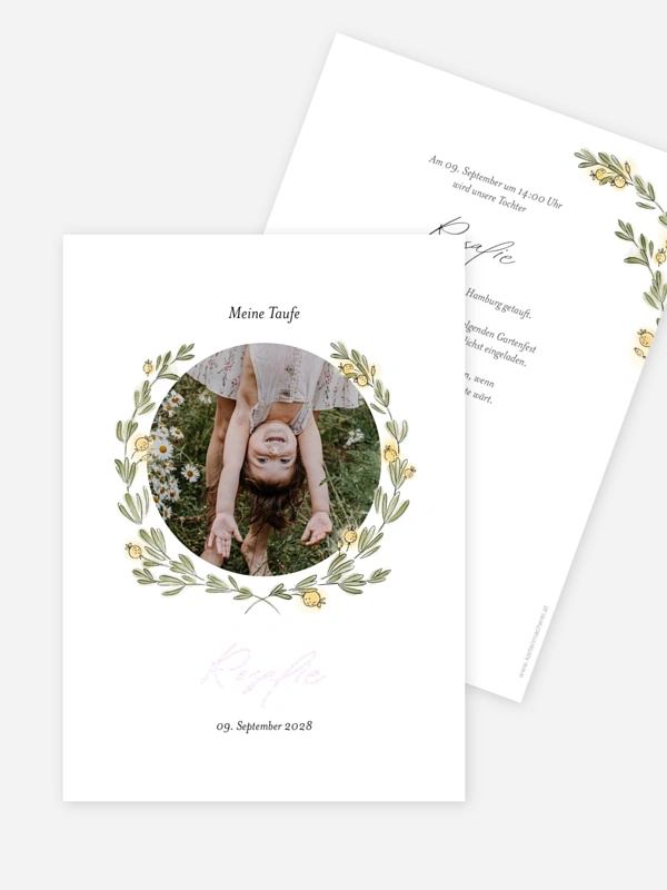 Mit der Taufkarte „Taufpoesie“ lädst du deine Lieblingsmenschen auf eine besonders herzliche Weise ein, diesen bedeutsamen Meilenstein gemeinsam mit euch zu feiern. Ein zarter Blätterkranz rahmt das Foto deines Schatzes liebevoll ein und macht eure Taufeinladung zu einer wertvollen Erinnerung für Familie und Freunde.
