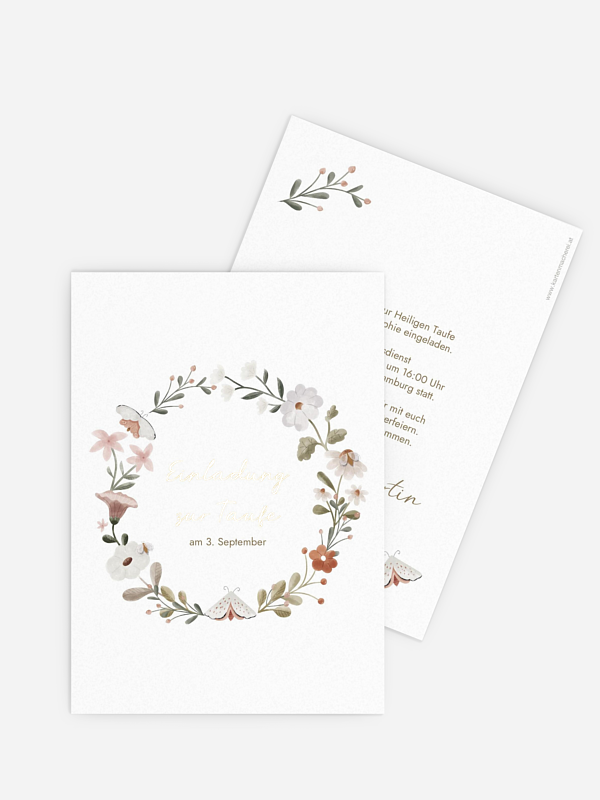 Zauberhafte Einladungskarte mit verträumten Illustrationen: auf der Taufeinladung "Waldspiel" wird der Schriftzug von einem liebevoll gestalteten Kranz umgeben.