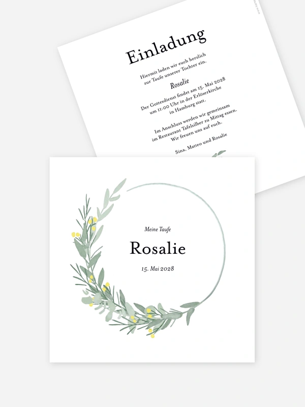 Mit der Taufeinladung "Zarter Eukalyptus" lädst du deine Lieblingsmenschen auf besonders herzliche Weise ein, diesen Meilenstein gemeinsam mit euch zu feiern. Der feine, handgemalte Blätterkranz rahmt die Details für das Fest wunderschön ein und verleiht deiner Einladung zur Taufe eine natürliche, ruhige Note.