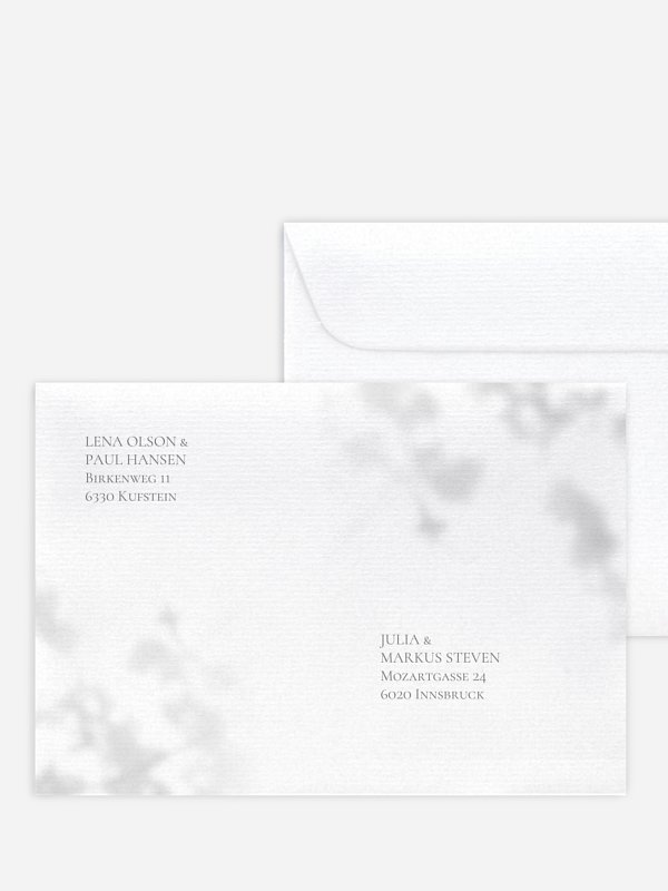Der personalisierbare Briefumschlag "Komorebi" ergänzt Ihre Einladung im passenden Design und macht Ihre Papeterie komplett. So beginnt der besondere Anlass schon mit dem ersten Blick in den Briefkasten.