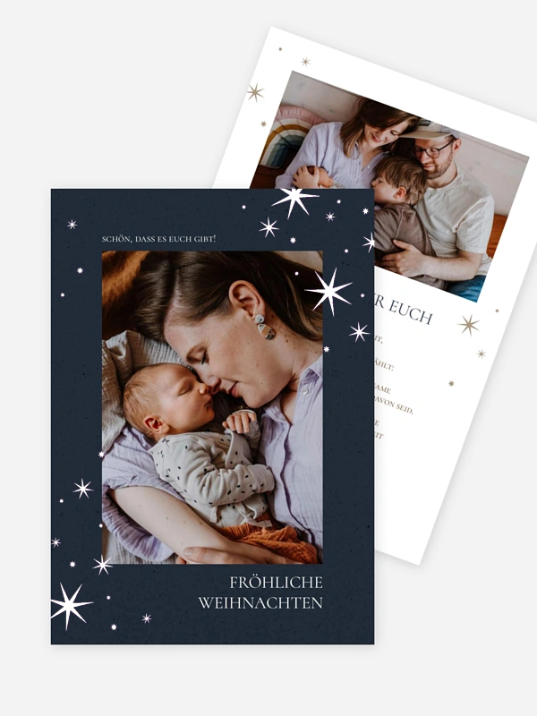 Die Weihnachtskarte "Funkelglück" bringt das Leuchten der festlichen Tage direkt in deine Hände. Zwischen sanften Sternen und liebevollen Worten wird jedes Familienfoto zu einem kleinen Weihnachtswunder. Eine schöne Art, Wärme und Nähe zu verschicken – an alle, die dir am Herzen liegen. Gedruckt auf hochwertigem Papier und ganz einfach im Gestaltungs-Tool personalisierbar. Gestalte deine Weihnachtskarte jetzt mit einem Hauch von Glanz und ganz viel Gefühl.
