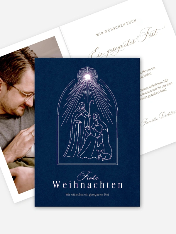 Überbringe deine Weihnachtsgrüße mit unserer besinnlichen Weihnachtskarte "Gesegnete Weihnacht". Das stilvolle Design rückt die traditionelle Weihnachtsbotschaft in den Mittelpunkt und schafft eine Atmosphäre des Friedens und der Einkehr. So teilst du auf eine herzliche und tiefsinnige Weise deine Wünsche für ein gesegnetes Fest mit deinen Liebsten. Die hochwertige Druckqualität unterstreicht den edlen Charakter dieser besonderen Karte.