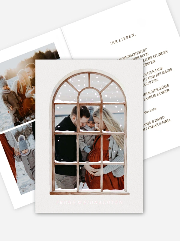 Die Weihnachtskarte "Schneemärchen" lässt den Zauber winterlicher Tage lebendig werden – warm, liebevoll und voller kleiner Momente des Glücks. Das verspielte Fensterdesign schenkt deinen Fotos eine festliche Bühne und lädt zum Träumen ein. Eine wunderschöne Art, persönliche Weihnachtsgrüße zu verschicken und Herzenswärme zu teilen. Hochwertig gedruckt und ganz einfach im Gestaltungs-Tool anpassbar – so wird aus jeder Karte ein echtes Lieblingsstück.