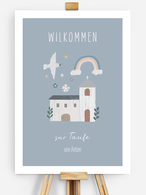 Mit dem Willkommensschild Taufe "Kleine Kirche Foto" heißt du eure Lieblingsmenschen zur Taufe auf eine leise, liebevolle Art willkommen. Die zarte Illustration mit Friedenstaube, Regenbogen und kleiner Kirche macht gleich klar: Heute geht’s um Segen, Nähe und ein bisschen Gänsehaut. Und das Beste: Du kannst alles ganz einfach im Gestaltungs-Tool personalisieren, wir kümmern uns um den hochwertigen Druck.