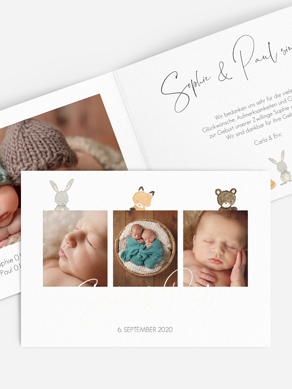 Hase, Bär und Fuchs präsentieren stolz den neuen Erdenbürger. Über die niedliche Zwillingskarte "Tierchen Trio" freut sich sicher jeder Adressat.