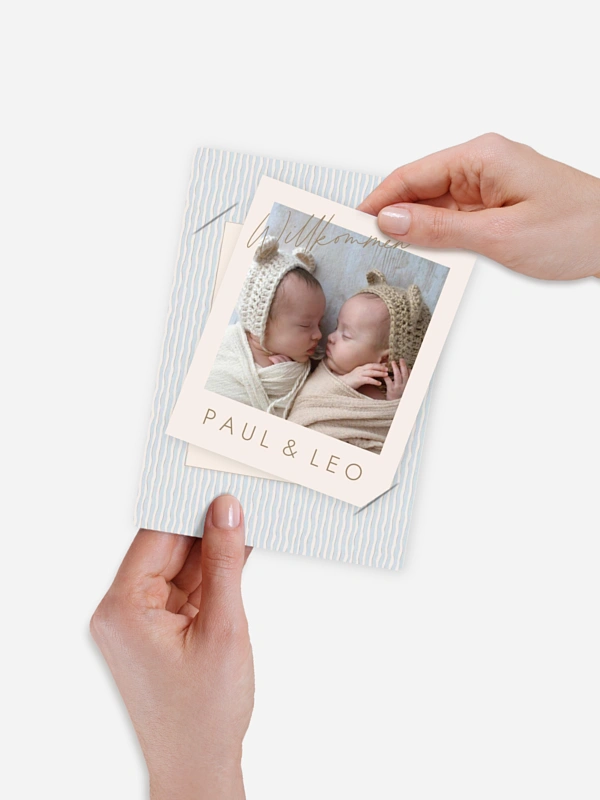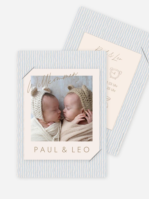 Die Zwillingskarte "Wavy Stripes" begrüßt eure kleinen Wunder auf besonders charmante Weise. Mit ihrem verspielten Design und Platz für ein inniges Foto wird sie zu einer liebevollen Geburtskarte für Zwillinge, die Freude und Nähe ausstrahlt. So kannst du Familie und Freund:innen euer doppeltes Glück auf ganz persönliche Art mitteilen. Hochwertige Papiere und eine schnelle Lieferung sorgen dafür, dass diese besondere Erinnerung schon bald bei euch ankommt.